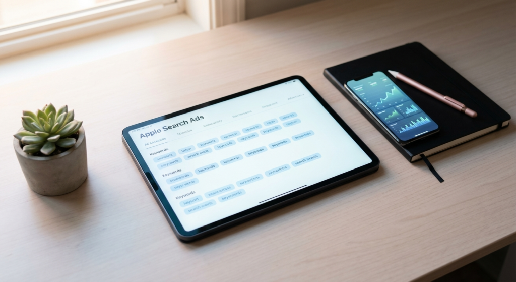 Learn how to choose the right keywords for Apple Search Ads: brand, category, and competitor terms, match types, negatives, and discovery campaigns.